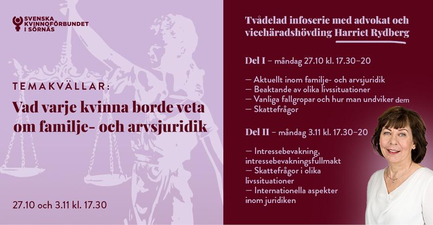 Föreläsare: Advokat Harriet Rydberg, styrelsemedlem i Svenska Kvinnoförbundet i Sörnäs.