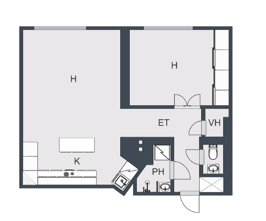 Lägenhet 2 rum, 55 kvm, med öppet kök, badrum och separat toalett i gott skick på Flemingsgatan 8. Hyran är 795 €/ mån. Lägenheten är nymålad.